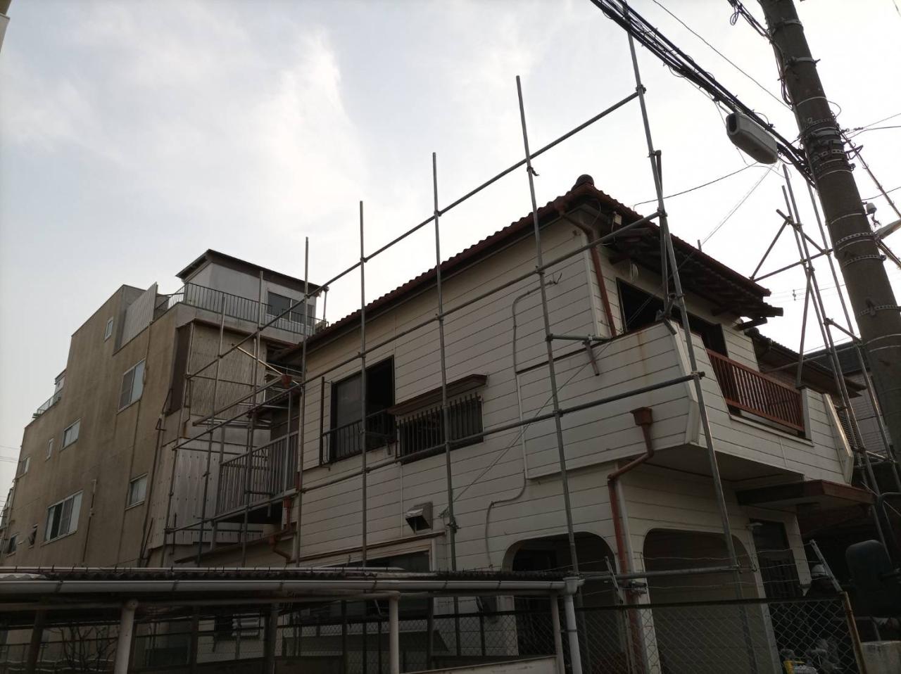 足場も組み上がり、内装解体から